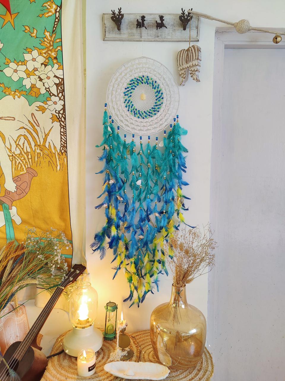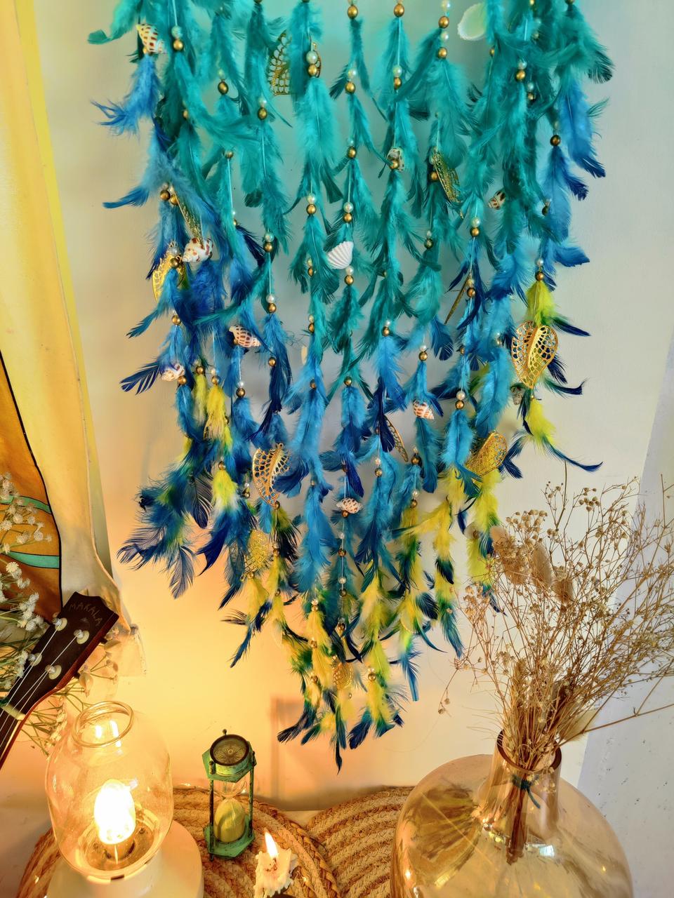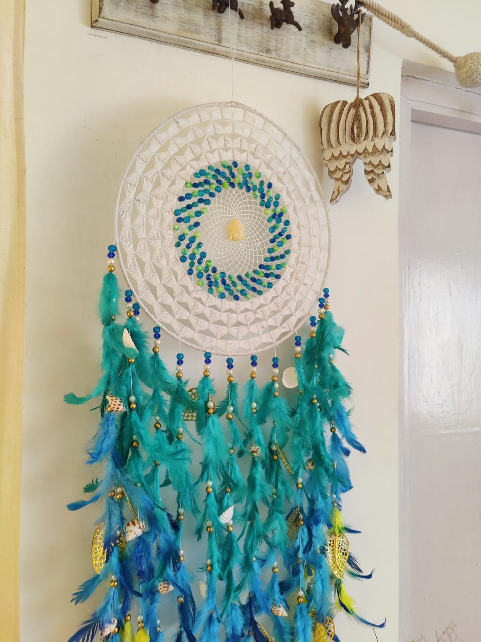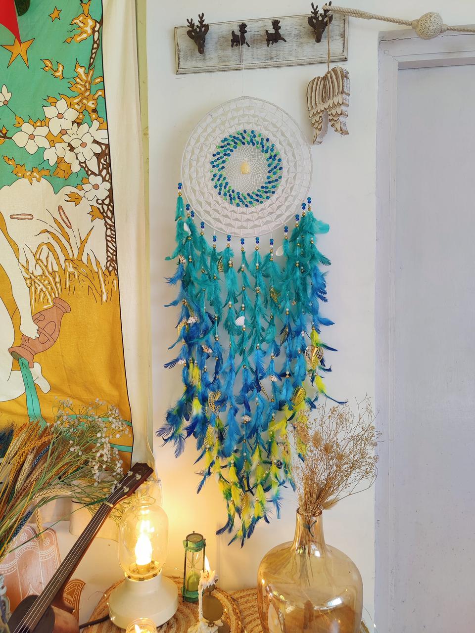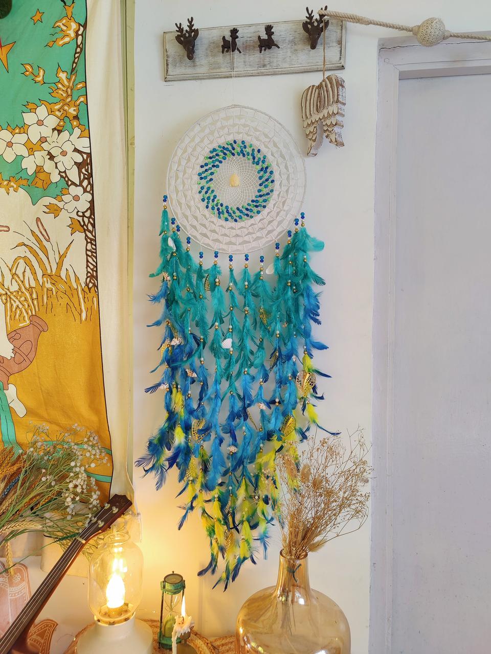 • Materials used : steel ring wrapped with wool and using cobweb work inside with using high quality feathers and metal charms for embellishments.