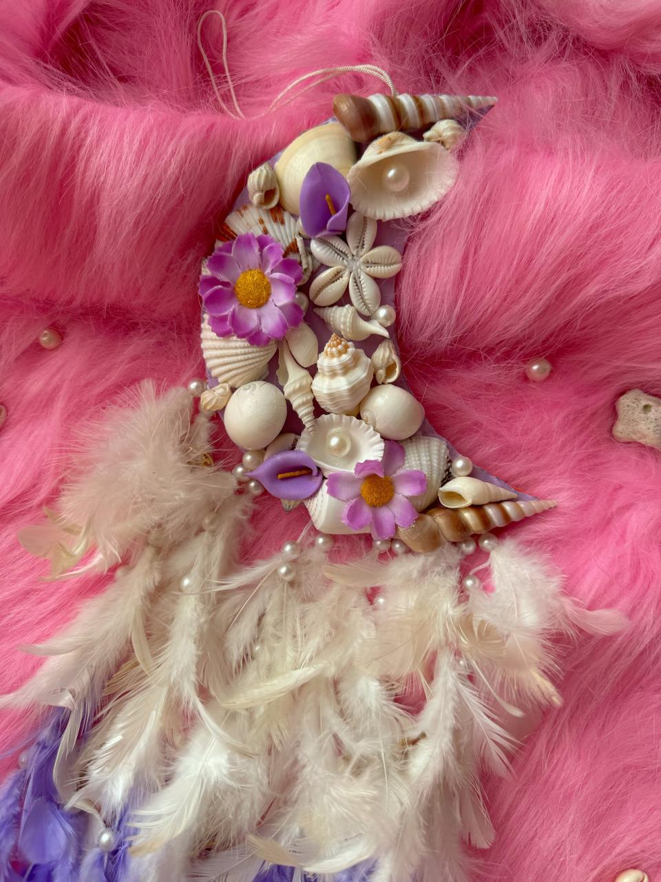Premium Materials: This wall hanging features a crescent moon shape intricately adorned with an assortment of seashells, including conches, scallops, and other marine treasures. The shells are artfully arranged to highlight their natural beauty and intricate textures.